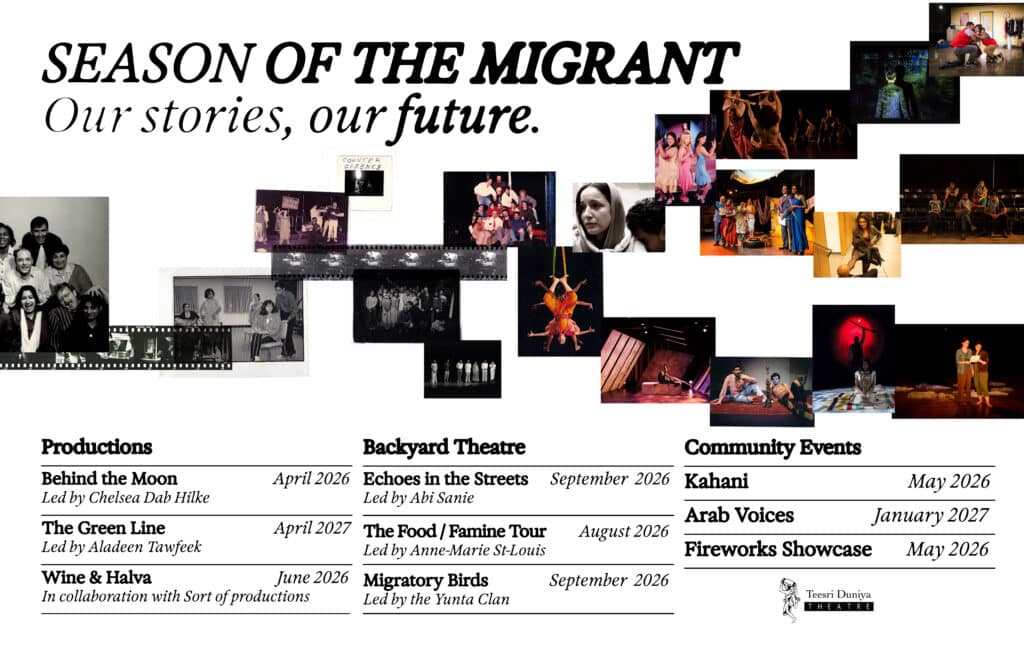 Teesri Duniya Theatre – Montréal Change the World One Play at a Time Theatre as a transformative tool. Bringing visible minorities from the margins to the center. What’s on Now Behind The Moon In a Mughlai restaurant in Toronto, a late-night visit from mysterious stranger, Jalal, rattles the cage and shatters the peace. Ayub, the restaurant’s employee, must […] Create With Us Play Submissions We welcome all playwrights whose work meets the above criteria and in which cultural diversity is significant in plot and characterization. Residencies and Internships Residencies and internships aim to build a new generation of BIPOC, LGBTQ+, gender diverse, artists and cultural workers across the sector. Fireworks The Fireworks Play Development Program is an intensive, structured and guided play development program. It is designed to assist emerging, socially engaged writers, particularly artists of colour and Indigenous peoples, queer and gender-diverse individuals, to develop their writing voice and professional profile. Fireworks is a development program for new and original plays. Rangshala Rangshala is our multipurpose, multifunction and convertible studio for productions, presentations and practice. Equipped with a convertible stage, lights and sound, it can seat up to 100 people. Teesri Duniya Theatre and organizations based in the Cité-des-Hospitalières carry out their works at the Rangshala and other studios. Rangshala is available to our partners, theatre companies, art groups, and communities for rehearsals, presentations, community gatherings, meetings, conferences and other events at affordable costs. Founders From One Cultural Strand to Many In 1981, Rana Bose and Rahul Varma co-founded the Teesri Duniya Theatre to address the absence of cultural diversity in Canadian theatre. Over the years, the company produced socially and politically charged plays featuring the lived and cultural experiences of visible minorities living in Canada. In 1986, Bose left Teesri to establish Montreal Serai, a diverse literary magazine. The same year, Varma became the company’s sole artistic director. Varma continued Teesri’s cultural and political mandate, expanding its scope of diversity and inclusion. “We see no separation between political and personal, between the issue and the aesthetic.” – Rahul Varma, Artistic Director, Teesri Duniya Theatre Donate Get Involved Help us tell the untold stories of those who are unseen and unheard. We appreciate your donations.