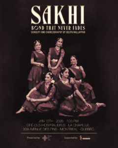 Sakhi – Bond that Never Fades January 10, 2026 to January 10, 2026 Teesri Duniya Theatre Synopsis On January 10th, 2026, come see the latest Param des arts production: SAKHI – Bond That Never Fades A maiden group production by @paramdesarts Conceptualized by Deepa Nallappan [ @deepanallappan ] Sakhi brings forward the beautiful bond of friendship — the connection that builds over time, the relationship that may drift apart, yet the yearning to reunite always remains. The presence of a sakhi is constant, often unspoken, often unrecognized… This production is an ode to all those sakhis whose hearts stay connected, no matter the distance. Date : 10th January 2026, Saturday Time : 7:00 PM to 7:40 PM Venue : La chapelle, 209 Av des Pins O, Montréal Ticket Link : https://www.montrealparam.ca/event-details/sakhi Manasa Murali Shreya Voore Kesahi Mathanachandran Thejaswini Vijjayakkumar Fariha Imran When January 10, 2026 7:00 pm - 9:00 pm Where Teesri Duniya Theatre 251 Av des Pins O, Montréal, QC 148 Montreal, Quebec H2W 1R6 Loading Map.... Teesri Duniya Theatre251 Av des Pins O, Montréal, QC 148 - MontrealEvents 45.512644 -73.578827