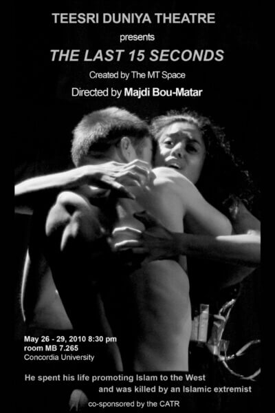 May 26 – 29, 2010 Les quinze dernières secondes Théâtre Université Concordia Dramaturges : Gary Kirkham, Nada Humsi, Anne-Marie Donovan, Pam Patel, Trevor Copp, Alan K. Sapp, Madji Bou-Matar Mise en scène : Madji Bou-Matar Les quinze dernières secondes reconstituent une conversation imaginaire entre le cinéaste Mustapha Akkad et sa fille Rima et Rawad Jassem Mohammad Abed, le kamikaze qui a perpétré l’explosion. La pièce explore les vies et les souvenirs imaginés de la victime et de son assassin alors qu’ils revisitent les vies de chacun après leur rencontre fatale. Distribution & Équipe Distribution Nada Humsi Anne-Marie Donovan Pam Patel Trevor Copp Alan K. Sapp Équipe créative Sheree Tams et William Chesney – Scénographes Sheree Tams – Costumière Jennifer Jimenez – Éclairagiste Rob Ring – Concepteur vidéo Nick Storring – Compositeur Anne-Marie Donovan et Pam Patel – Voix Joe Recchia – Régisseur