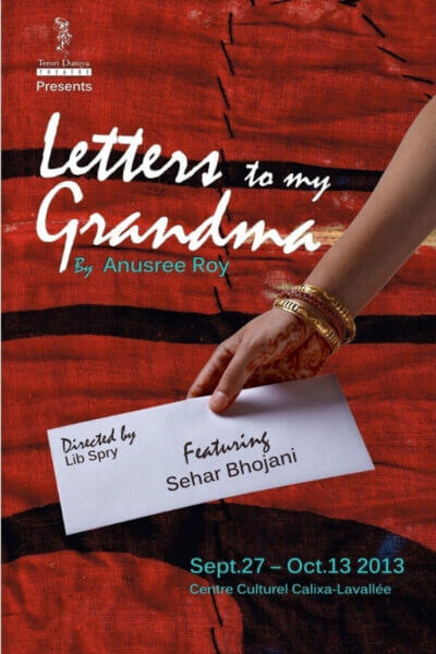 27 septembre – 13 octobre 2013 Lettres à ma grand-mère Centre Culturel Calixa-Lavallée Dramaturge: Anusree Roy Mise en scène: Lib Spry En lisant de vieilles lettres le jour de son mariage, Malobee découvre la lutte de sa grand-mère pour survivre à la partition de l’Inde en 1947. Elle commence à interpréter le passé caché de sa grand-mère sous différents angles alors qu’elle lutte pour créer une nouvelle vie au Canada. Distribution & Équipe Distribution Sehar Bhojani Équipe créative Davide Chiazzese – Assistant metteur en scène Melanie St-Jaques – Régisseuse Laurence Gagnon – Costumière Jody Burkholder – Éclairagiste Dumisizwe Vuyo Bhemtoe – Musique & Son Alex Smith – Assistant de production Lire les critiques One actor, four characters (The McGill Daily) Letters to My Grandma: a story of racial bias, love and amnesty (The McGill Tribune) Hatred Divides Nations and Families (Montreal Gazette) Points forts des critiques