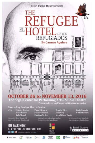 26 octobre – 13 novembre 2016 L’Hôtel des Réfugiés Centre Segal Studio Dramaturge: Carmen Aguirre Directrice: Paulina Abarca-Cantin Assistante à la mise en scène: Sophie Gee Dans le sillage du coup d’État chilien de 1973, L’Hôtel des Réfugiés raconte une histoire d’exil, de traumatisme et de l’expérience de réinstallation au Canada. Distribution & Équipe Distribution Charles Bender Pablo Diconca Braulio Elicer Craig Francis Ziad Ghanem Shanti Gonzales Juan Grey Gilda Monreal Sally Singal Mariana Tayler Vera Wilson Valdez Bryan Javia Équipe Créative/strong> Bruce Gibbons Fell – Traduction et Surtitres Audrey-Anne Bouchard – Gestionnaire de la lumière et de la production James Douglas – Assistant de production Diana Uribe – Décors et costumes Martha Moncaleano De La Torre – Assistante costumière Scott Wardell – Vidéo et son Christopher Jesse Ash – Concepteur sonore associé Danielle Skene – Régisseuse Orlando Lopez – Régisseur adjoint Bruce Lambie – Directeur technique Janis Kirshner – Publiciste/Relations avec les médias Bryan Javia – Danseur de Cueca Lire les critiques Teesri Duniya Theatre presents THE REFUGEE HOTEL at the Segal Centre from Oct 26 – Nov 13 – A Dark Comedy about Exile, Love and the Canadian Resettlement Experience (Montreal Theatre Hub) The Refugee Hotel sends a powerful message (Westmount Mag) Montreal play offers critical look at Canada’s refugee response (CBC News) Points forts des critiques