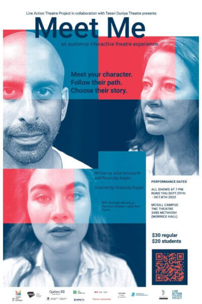 September 29 – October 8, 2022 Meet Me McGill Campus Playwrights: Rosaruby Kagan & Julia Ainsworth Director: Rosaruby Kagan Produced by Live Action Theatre Project In Collaboration with Teesri Duniya Theatre The Live Action Theatre Project, in collaboration with Teesri Duniya Theatre, presents the world premiere of Meet Me, a branching narrative, audience-interactive theatre experience. It explores dating, cancel culture, consent in the post #metoo era and the multiplicity of pathways a person can take to find a resolution. The audience decides how the story gets told. This work was supported by the Social Sciences and Humanities Research Council of Canada; IMPACTS: Collaborations to Address Sexual Violence on Campus; Social Sciences and Humanities Research Council of Canada Partnership. Cast Darragh Mondoux – Gemma Zeshaun Saleem – Qas Leigh Ann Taylor – Roslyn Creative Team Rosaruby Kagan – Director/Playwright Julia Ainsworth – Playwright Stephanie Merulla – Media/ Digital Content Writer Zeshaun Saleem – Text Contributions/Cultural Consultant Ahlam Gholami – Assistant Director Meagan Schroder – Intimacy Director Chad Dembski – Production Manager Adam Walters – Technical Director/ LX Design and Video Elyse Quesnel – Stage Manager Rachel-Anne Germinario – Set and Costume Designer Leticia Chicoine – Assistant Set and Costume Designer Rob Denton – Sound Designer Claire Bourdin – Assistant Sound Designer Jacob Niedzwiecki – App Developer /Creator Nicole Goertzen – App Developer /Programmer Sarah Elkashef – Dramaturge/ Playwrights Workshop Montreal Nate Plong – Graphic Designer/Media Content Generator Charlie Joubert – Graphic Designer Janis Kirshner – Publicist